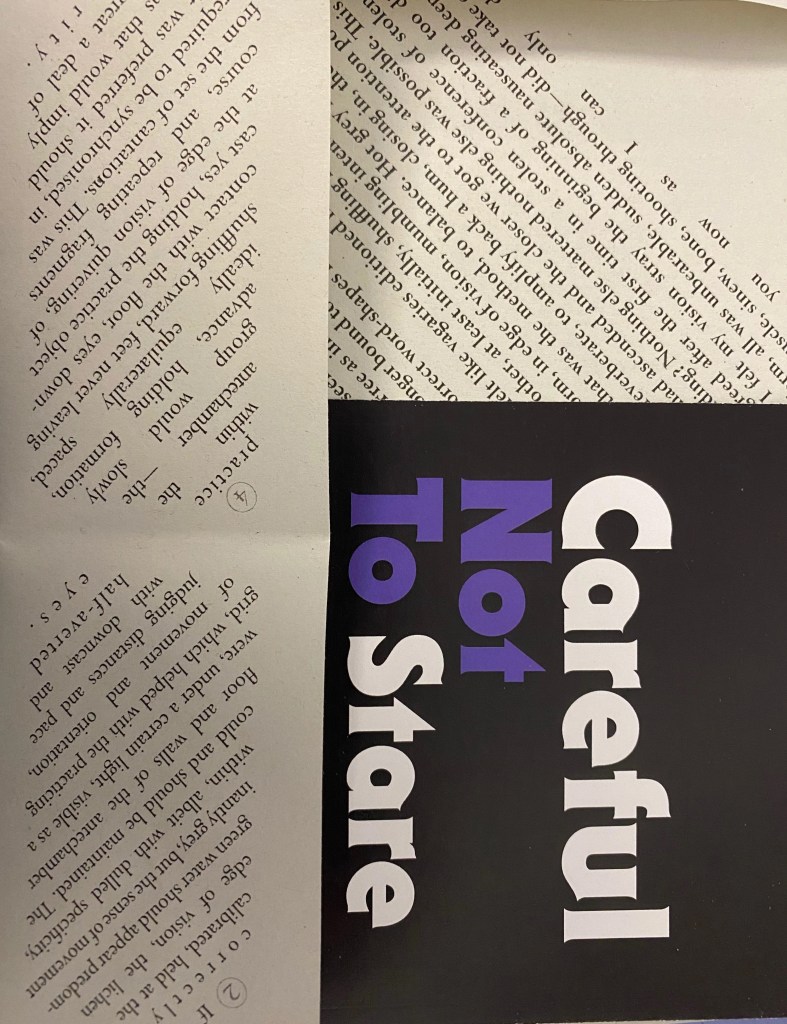 Careful Not To Stare, Careful Not To Look Away, is a collection of works consisting of models (Attention Points) a text, initially sent as a mail project (The Inner Room) a video of models and animated text (Scene From After Now) and a text sent initially as an email (The Theft).