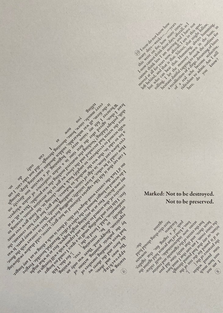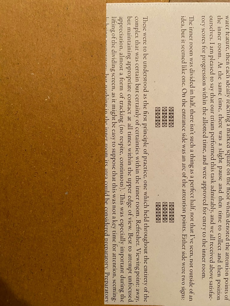 The procedure for movement within the inner room was set and would require, at a minimum, a day of focused practice within the antechamber—the group would slowly advance, holding formation, ideally equilaterally spaced, shuffling forward, feet never leaving contact with the floor, eyes downcast yes, holding the practice object at the edge of vision quivering, of course, and repeating fragments from the set of cantations. This was not required to be synchronised, in fact it was preferred it should not, as that would imply to great a deal of clarity. Somewhere between a mutter and a mumble was judged best—I would have it so not no other, repeat this so my fate forever—at all times this material usual and familiar never too familiar and not to exceed the regulatory groan of the filtration unit…”